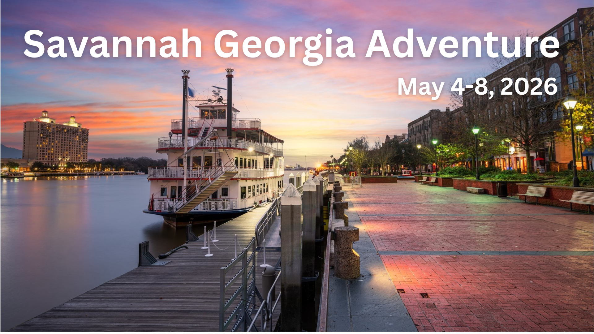 A Savannah Adventure includes: lunch at Pirates House, Andrew Low House & Museum, Historic Tour of Savannah, Lunch on River Street (on your own) & shopping, Georgia Queen Riverboat Dinner Cruise, Dinner at Stately Oaks Plantation - inspiration for Gone with the Wind! Click the button below for more information and to register.